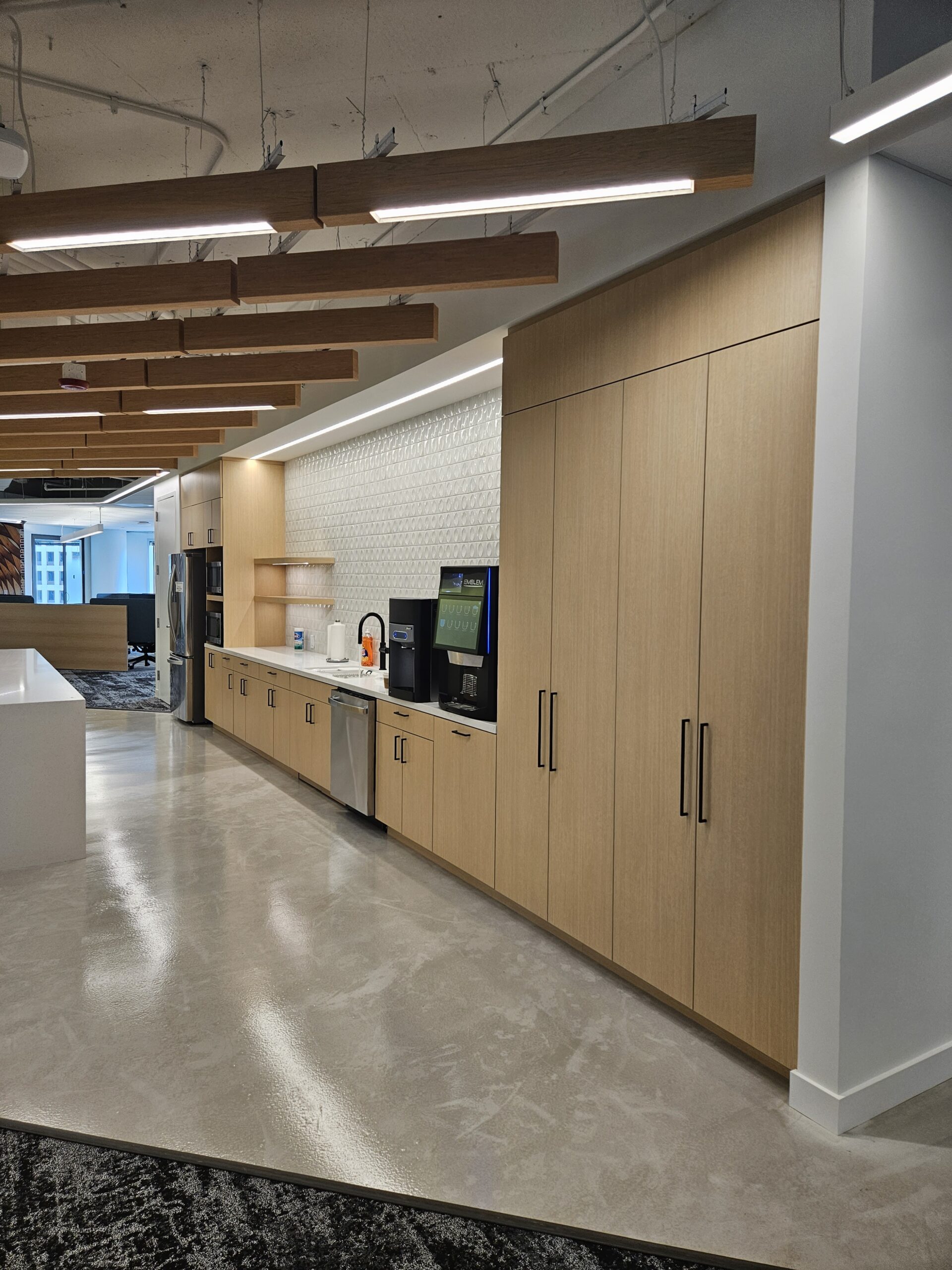Finish Spotlights – Nevamar Straightaway Oak custom slats, Caesarstone quartz counters, Solid ash tambour walls, custom tambour millwork reception desk, Feature Stadium seating with Custom curved Ash nosings, handrail and treads.